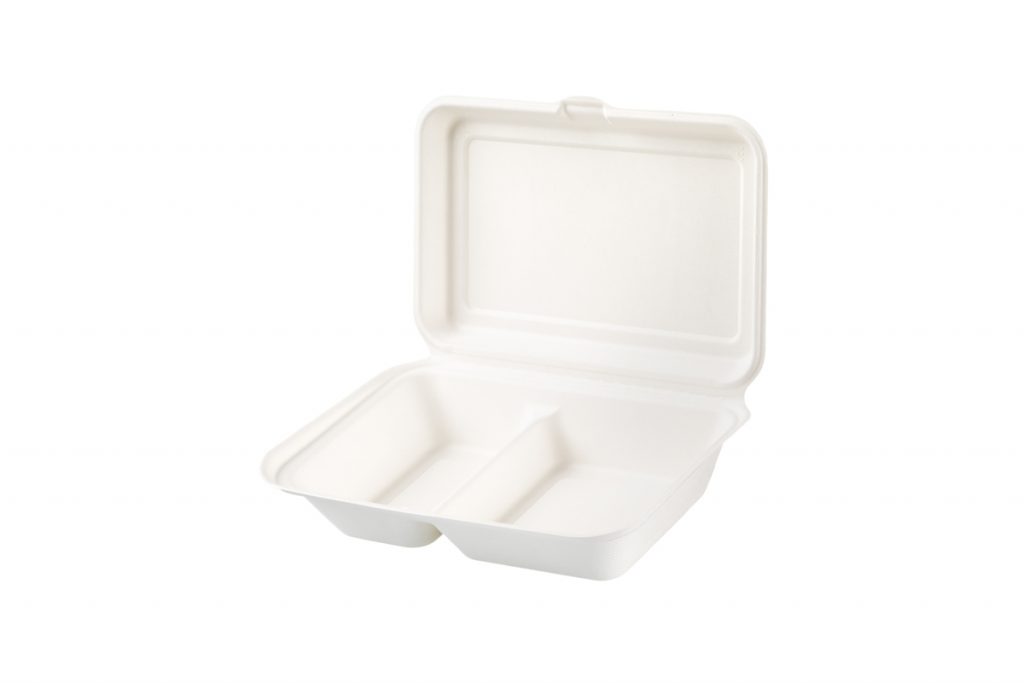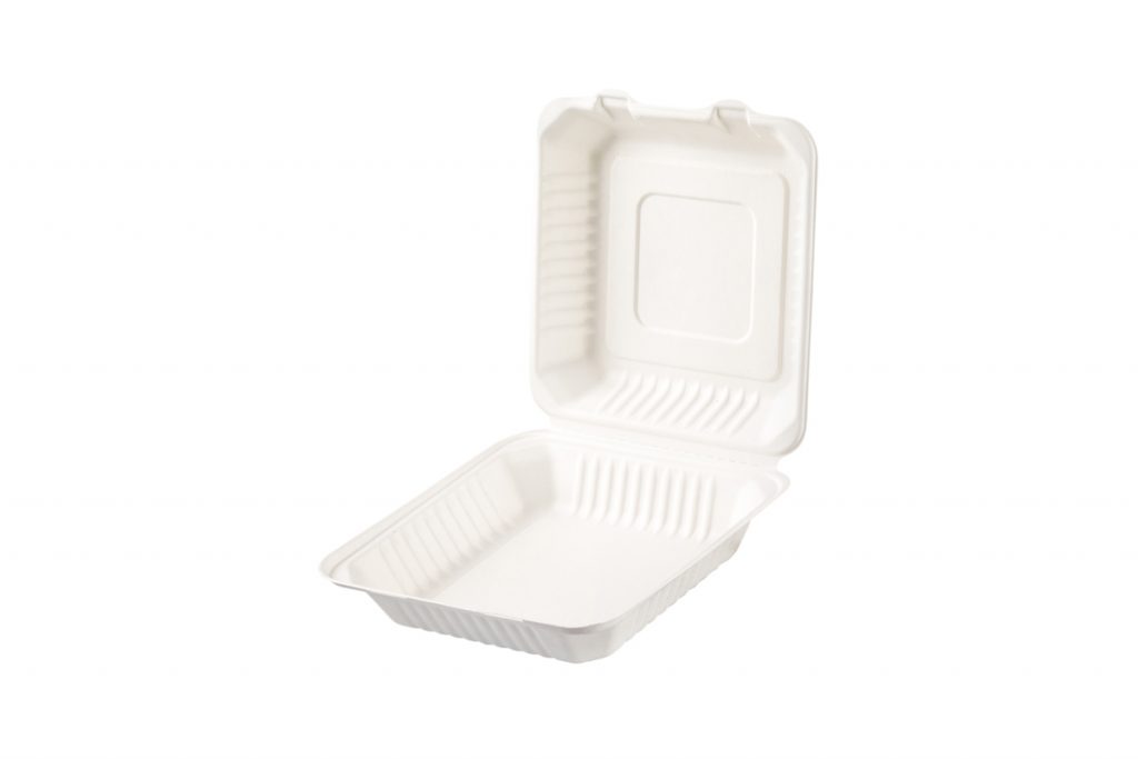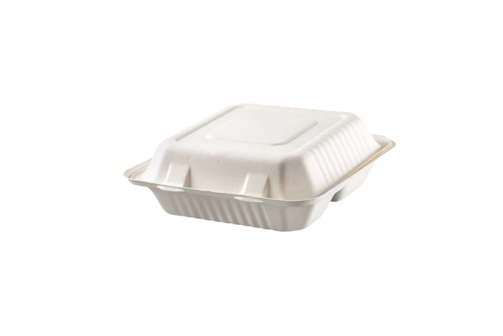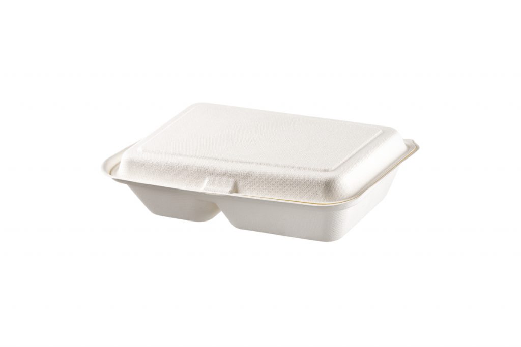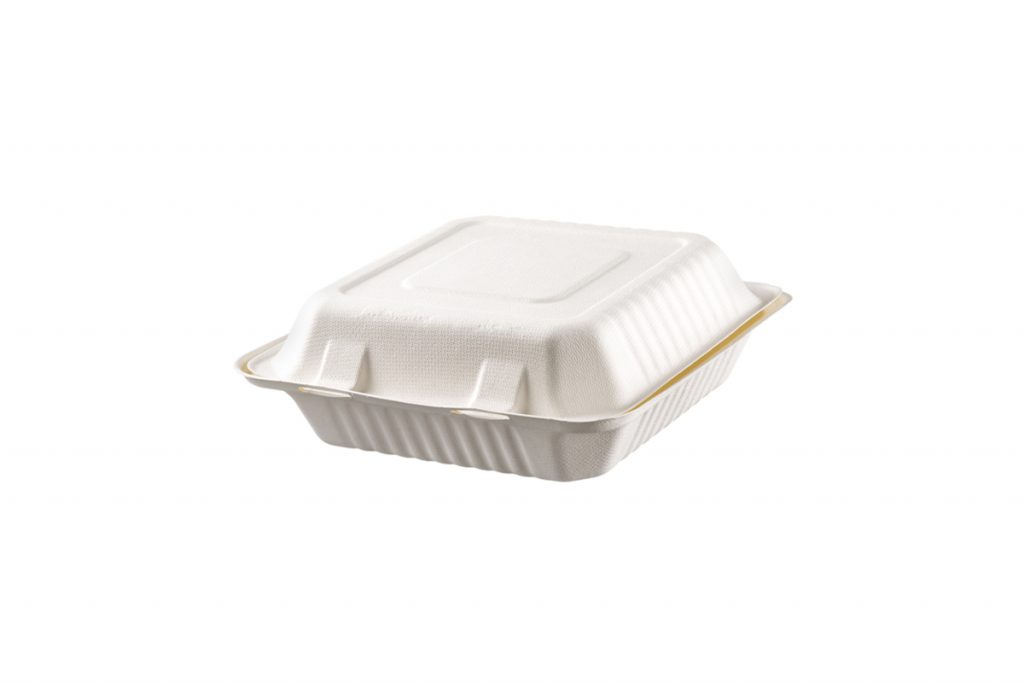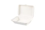 Σκεύος φαγητού, με ενσωματωμένο καπάκι, μίας θέσης, παραλληλόγραμμο, 23×15χ9cm, από ζαχαροκάλαμο, λευκό, βιοδιασπώμενο και κομποστοποιήσιμο. Ένα plastic free προϊόν εναρμονισμένο με τις νομοθετικές απαιτήσεις της Ε.Ε.. Αποτελεί εναλλακτική λύση για την αντικατάσταση των αντίστοιχων σκευών από διογκωμένη πολυστερίνη (EPS -foam). Ανθεκτικό σε χαμηλές και υψηλές θερμοκρασίες. Κατάλληλο για φούρνους μικροκυμάτων, για κρύα και ζεστά τρόφιμα. Ελαφρύ και ταυτόχρονα στιβαρό.