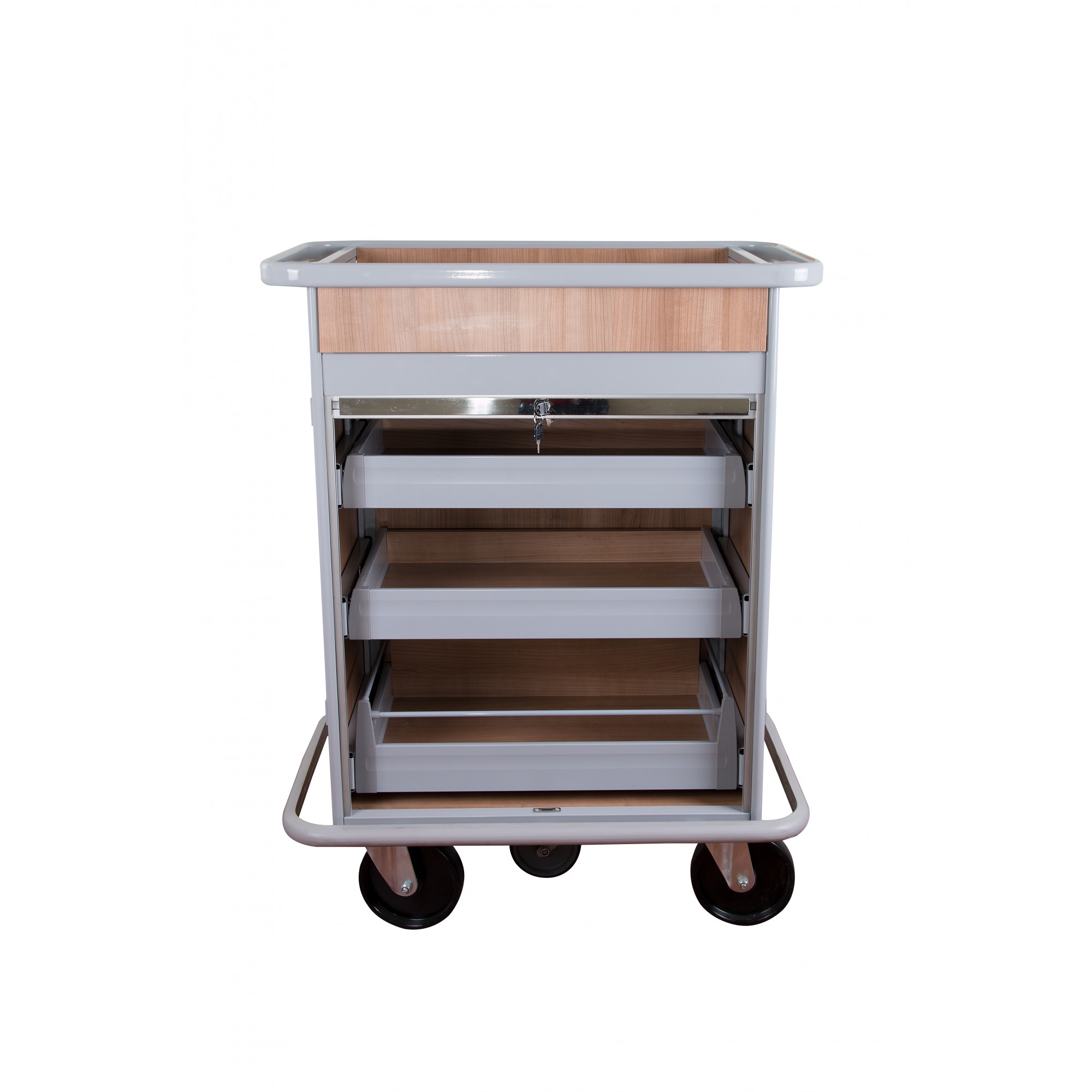 Τρόλεϊ τροφοδοσίας mini bar ξύλινο με 3 συρτάρια και συρόμενο ρολό με κλειδαριά.
